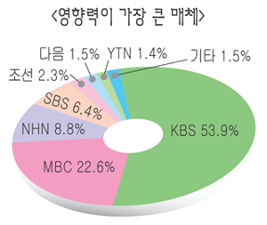 KBS에 이어 영향력이 큰 매체로는 MBC(22.6%) NHN(8.8%) SBS(6.4%) 조선일보(2.3%) 다음(1.5%) YTN(1.4%) 중앙일보(0.6%) SK컴즈(0.5%) 동아일보(0.4%) 등의 순으로 조사됐다.