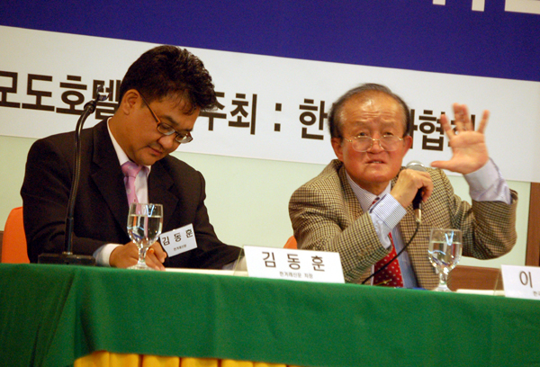 ▲ 이성춘 기자상 심사위원(오른쪽)이 지난달 29일 경주 코모도호텔에서 열린 ‘기자상 포럼’에서 발제하고 있다. |