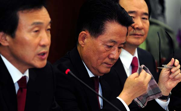 ▲ 민주당 박지원 원내대표가 3일 오전 국회에서 열린 최고위원회의에서 손수건으로 눈을 닦고 있다.(뉴시스) |