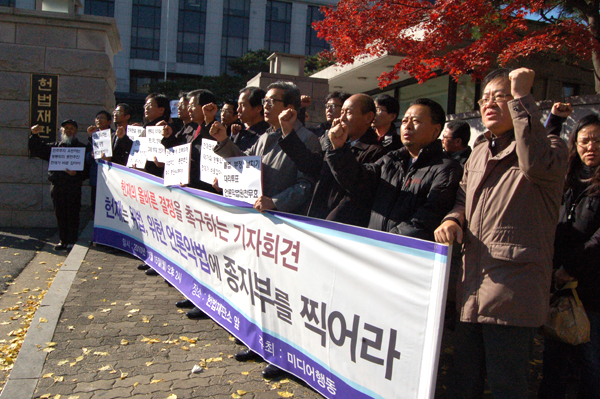 ▲ 15일 서울 종로구 헌법재판소 앞에서 열린 미디어행동 주최의 기자회견에서 참석자들이 헌재의 미디어법 부작위권한쟁의 심판 결정을 촉구하는 구호를 외치고 있다. |