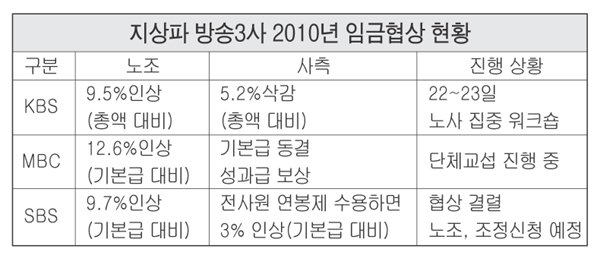 지난 2년간 임금이 동결됐던 지상파방송 3사 노조가 올해는 임금을 올릴 수 있을까. KBS, MBC, SBS 등 지상파방송 노조가 2010년 임금협상에서 인상을 요구했지만 사측이 거부 의사를 보이면서 난항을 겪고 있다.