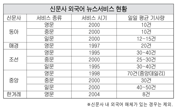현재 영문·중문·일문 3개 외국어 뉴스서비스를 하는 신문사는 동아·조선·중앙일보 등이다.