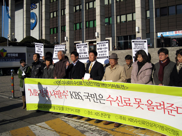 ▲ 5백여 개 시민사회단체로 구성된 ‘KBS수신료인상저지범국민행동’은 22일 KBS 본관 앞에서 KBS 이사회의 수신료 인상 의결을 규탄하는 기자회견을 열고 “‘이명박 정권 나팔수’로 전락한 KBS를 위해 단 한 푼의 수신료도 인상할 수 없다”고 주장했다. |