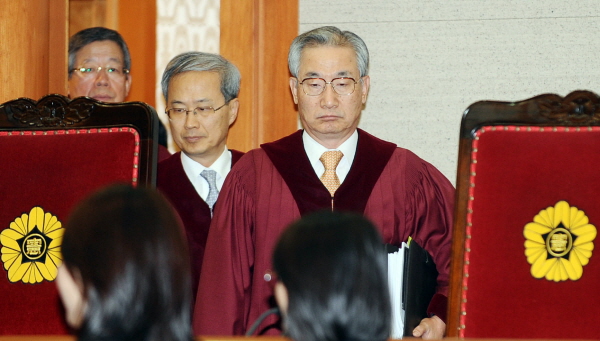 | ▲ 25일 오후 종로구 헌법재판소 대심판정에서 언론법 관련 부작위 소송 선고를 위해 이강국 헌법재판소장 등 재판관들이 입장하고 있다.(뉴시스) | ||