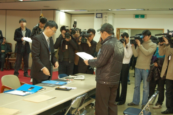▲ 정병일 CBS 매체정책부장(사진 앞줄 오른쪽)이 1일 방송통신위원회에 보도전문채널 사업자 신청 서류를 접수하고 있다. |