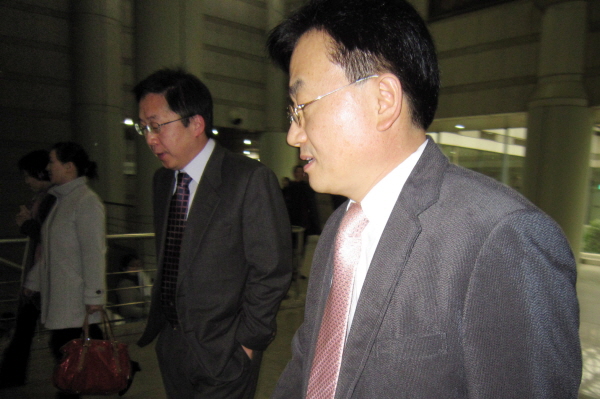 ▲ MBC PD수첩 조능희 CP(오른쪽)가 항소심 재판부의 무죄 판결을 받은 뒤 김형태 변호사와 함께 법정을 빠져나오고 있다.(뉴시스) |