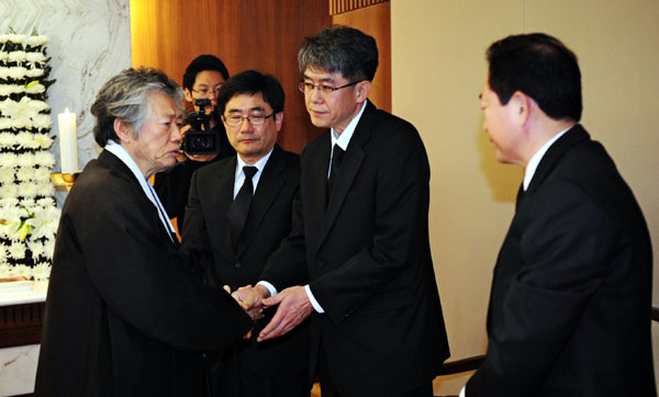 | ▲ 국민참여당 이재정 대표와 유시민 전 의원이 유족들을 위로하고 있다.(뉴시스) | ||