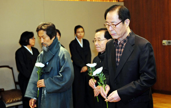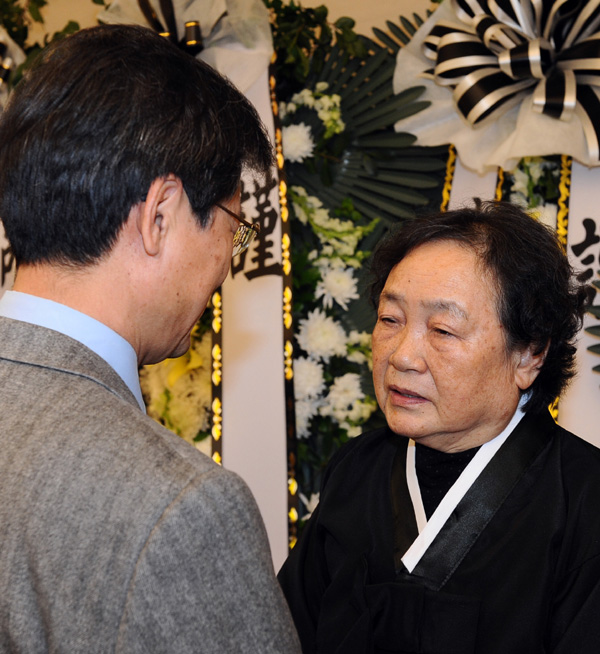 | ▲ 민주당 천정배 의원이 조문을 마치고 리영희 교수의 부인 윤영자씨를 위로하고 있다.(뉴시스) | ||