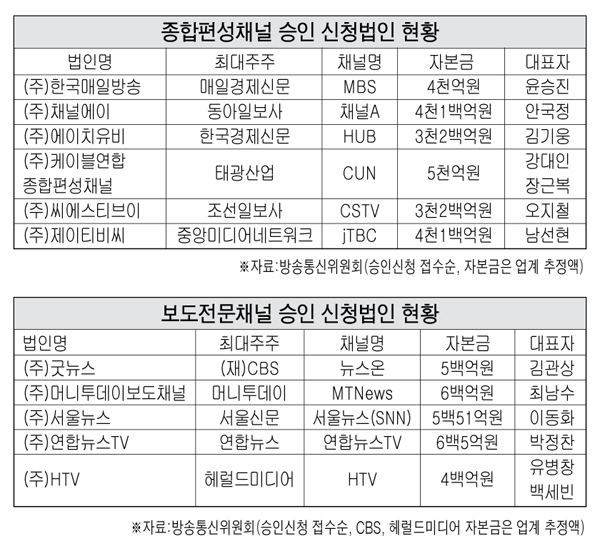 “납입자본금 많으면 유리”방통위가 지난 1일 사업신청서를 접수한 결과 예상대로 종편의 경우 동아일보, 매일경제, 조선일보, 중앙일보를 계열사로 둔 중앙미디어네트워크, 태광산업, 한국경제 등 6곳, 보도는 머니투데이, 서울신문, 연합뉴스, 헤럴드미디어, CBS 등 5곳이 지원했다.