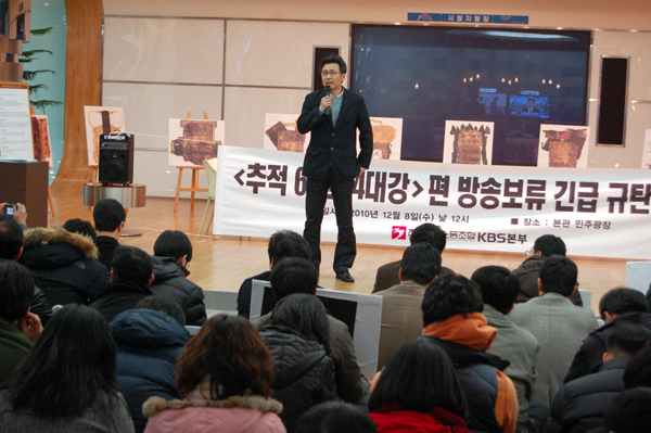 ▲ 전국언론노조 KBS본부가 추적60분 방송보류에 청와대 관계자의 외압이 있었다고 밝혔다. 사진은 지난 8일 서울 여의도 KBS본관 ‘민주광장’에서 열린 추적60분 방송보류 규탄대회에서 발언하고 있는 엄경철 본부장. |