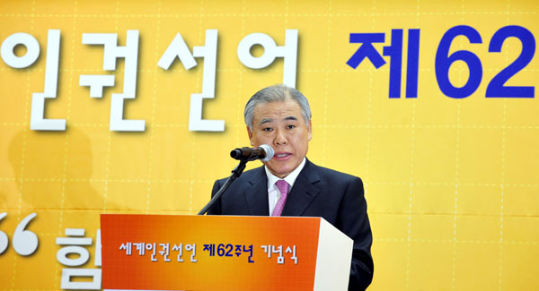 ▲ 10일 오전 서울 중구 프레지던트호텔 슈베트홀에서 열린 세계인권선언 제62주년 기념식에서 현병철 국가인권위원회 위원장이 기념사를 하고 있다.(뉴시스) |