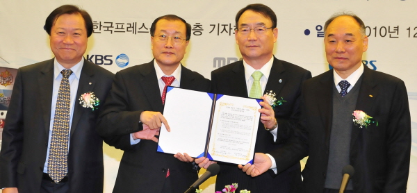 | ▲ 16일 오전 서울 태평로 한국프레스센터에서 지상파 4사 사장들이 '시청자 서비스 강화' 공동사업추진 협약식을 갖고 있다. 왼쪽부터 우원길 SBS 사장, 김재철 MBC 사장, 김인규 KBS 사장, 곽덕훈 EBS 사장.(뉴시스) | ||
