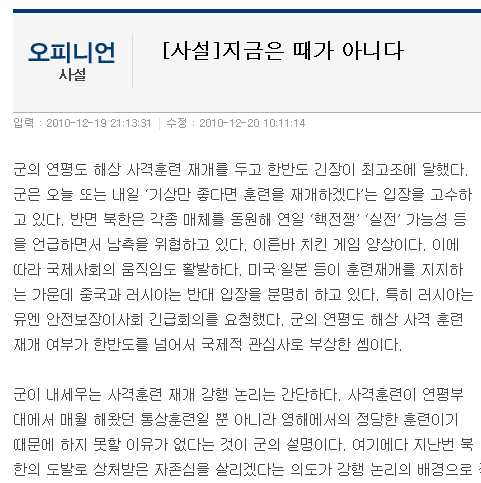 남북 간 군사적 위기감이 높아지고 있는 이날 주요 신문들의 사설은 ‘정면 충돌을 가져올 수 있는 만큼 사격훈련을 중지해야 한다’는 쪽과 ‘서해 5도 수역에 대한 한국의 주권을 재확인하기 위해서라도 반드시 해야한다’는 쪽으로 갈렸다. 일부 신문은 중국과 러시아의 훈련 반대 입장에 불편한 심기를 노출하기도 했다.
