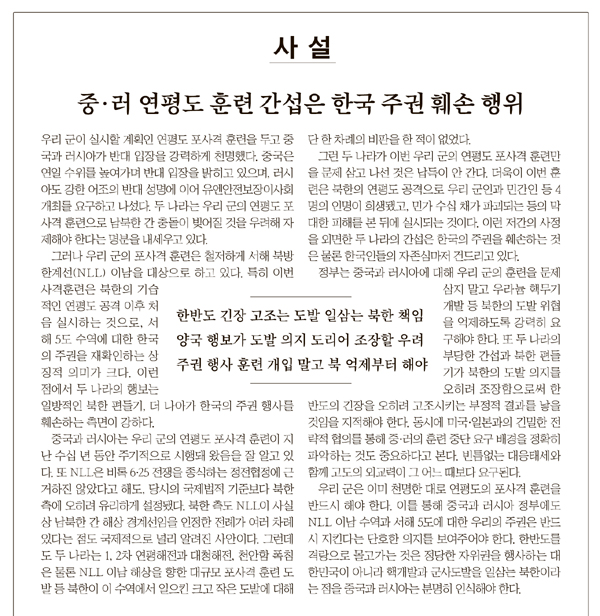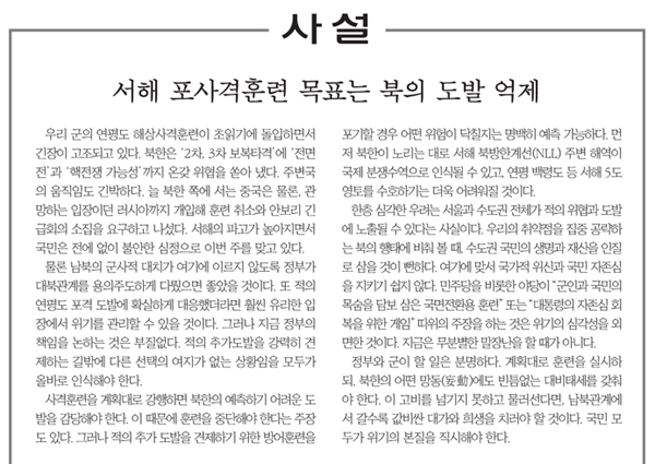 사설은 “우리 군은 이미 천명한 대로 연평도의 포사격 훈련을 반드시 해야 한다”며 “이를 통해 중국과 러시아 정부에도 서해 북방한계선(NLL) 이남 수역과 서해 5도에 대한 우리의 주권은 반드시 지킨다는 단호한 의지를 보여주어야 한다”고 밝혔다.