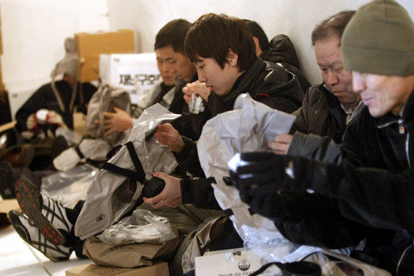 ▲ 20일 우리 군의 연평도 일원 해상사격훈련 실시가 임박한 가운데 방공호에 대피한 연평도 주민들이 방독면을 점검하고 있다. (뉴시스) |