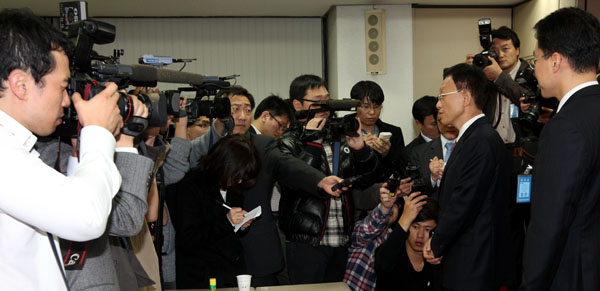 ▲ 지난 1일 오후 방송통신위원회에서 종합편성채널사업계획서를 제출한 한 회사 관계자에게 많은 취재진이 몰려 취재경쟁을 벌이고 있다.(연합뉴스) |