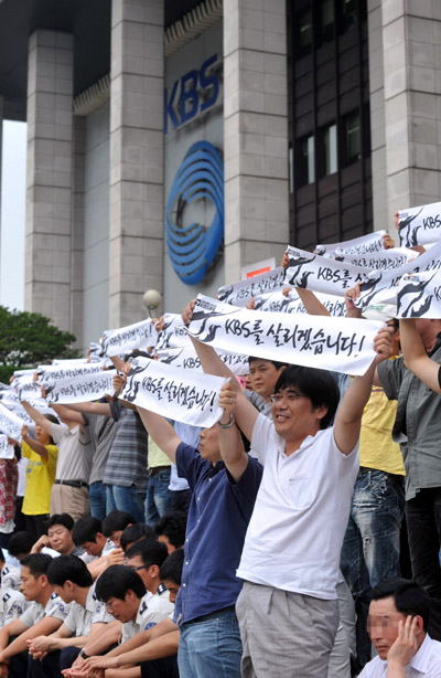 ▲ 지난 7월 1일 오전 서울 여의도 KBS 본관앞에서 KBS노조 총파업 출정식이 열리고 있다.(뉴시스) |
