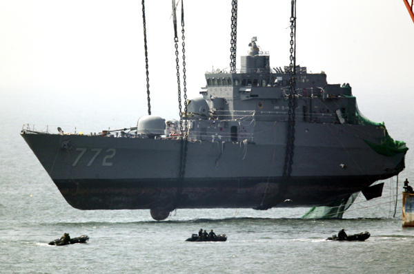 ▲ 지난 3월 26일 백령도 서남방 해상에서 초계 근무 중 침몰한 해군 초계함 천안함의 함수가 4월 24일 인양되고 있다. (뉴시스) |