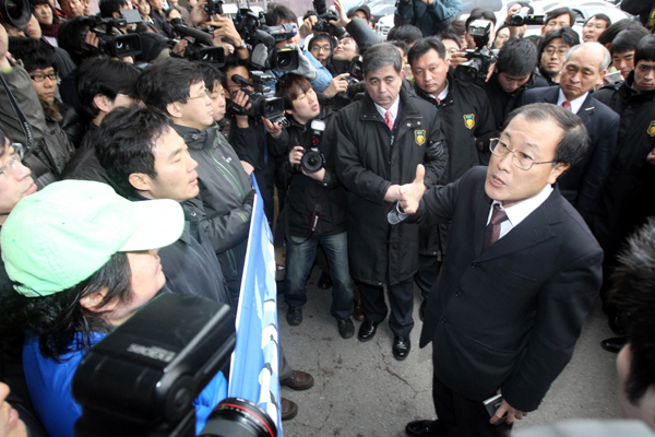 ▲ 김재철 MBC 신임 사장이 지난 3월 2일 오전 서울 여의도 MBC 본사 앞에서 출근 저지 투쟁에 나선 노조원들과 설전을 벌이고 있다.(연합뉴스) |