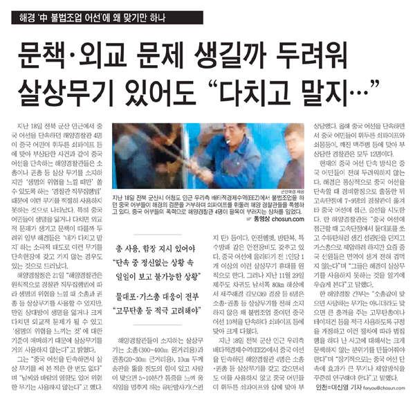 조선일보는 23일자 3면 ‘국제법 어긴 중국의 적반하장’ 기사에 해경이 군산 앞바다에서 중국어선을 추적한 당시 시간대별 상황을 그래픽으로 보여주면서 중국 선원이 쇠파이프로 저항하고 있는 사진을 함께 실었다.