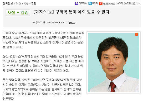 ◇방역이냐, 알권리냐=한국일보 최흥수 기자는 이에 대해 "통제선을 넘지 않았더라도 살처분 예정된 소를 접촉하는 자체가 위험한 것"이라며 "구제역이 전방위로 확산되고 있는 만큼 기자들도 조심을 해야 한다는 취지"라고 말했다.