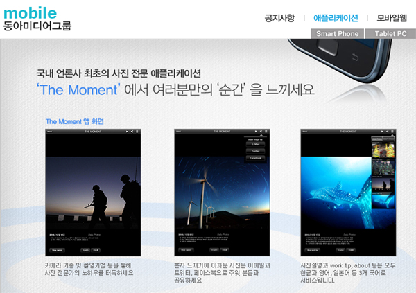 동아일보 관계자는 “‘The Moment’는 최근 한글 앱스토어 사진 카테고리에서 LIFE, Eyewitness, Getty Image 등 글로벌 애플리케이션의 다운로드 건수를 앞지르며 콘텐츠 앱으로는 최다 매출을 올리고 있다”고 말했다.