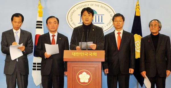| ▲ 민주당 문화체육관광방송통신위원회 의원들이 지난달 31일 오후 국회 정론관에서 조선, 중앙, 동아, 매경이 종합편성채널사업자로 연합뉴스가 보도전문채널로 선정돼 규탄기자회견을 하고 있다. 왼쪽부터 최문순, 장병완, 서갑원, 천정배, 최종원 의원.(뉴시스) | ||