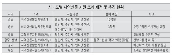 광주·전남은 광주전남기자협회가 주도가 돼 지역신문 등에 광주시와 전남도의 지원근거를 담은 ‘지역언론 지원 조례’ 제정을 추진하고 있다. 전남의 경우 2월 통과를 목표로 추진 중이며 광주시는 실무 검토에 들어갔다고 기자협회 측은 밝혔다. 조례안에는 NIE(신문활용교육) 실시, 기자 재교육, 근무환경 개선 등이 담긴다. 박원우 협회장은 “예산은 시·도 각각 5억원, 연간 10억원을 목표로 하고 있다”고 말했다.