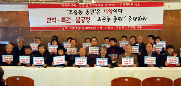참여연대, 환경연합, 보건의료단체연합, YMCA, 민주언론시민연합(민언련) 등 2백12개 시민사회단체는 18일 서울 정동 프란치스코 회관에서 기자회견을 열고 ‘조중동 종편 선정 취소·추가특혜를 반대하는 시민사회단체 선언’을 발표했다.