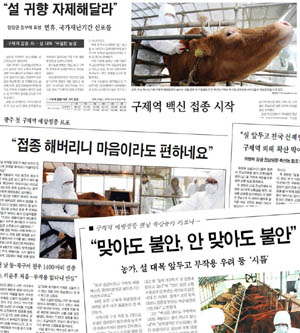구제역 확산의 마지막 보루인 전남지역 22개 시·군에서 지난 16일부터 예방백신 접종이 시작됐다. 지역 언론들은 17일자에 백신 접종 시작을 일제히 보도하고 현장 르포 기사를 실어 접종 첫날의 농가 표정을 긴박하게 전했다.