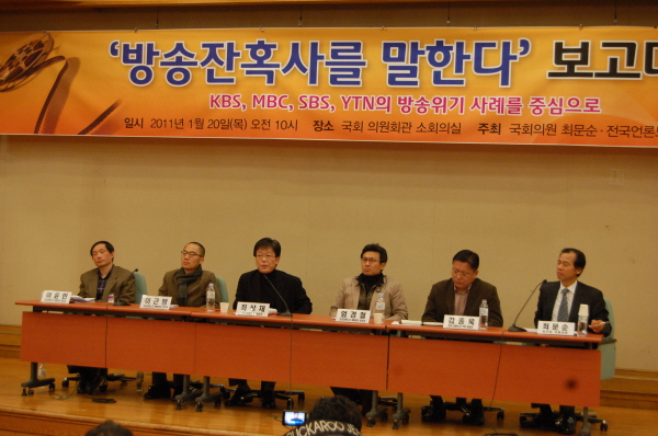 20일 전국언론노조와 최문순 민주당 의원 주최로 국회 의원회관 소회의실에서 열린 ‘방송 잔혹사를 말하다’ 보고대회에서 엄경철 KBS본부 위원장, 이근행 MBC본부 위원장, 이윤민 SBS본부 위원장, 김종욱 YTN지부 위원장은 각 회사별 실정을 발표하고 결의를 다졌다.