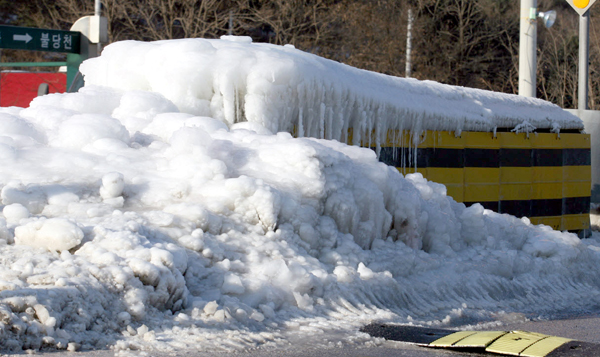 | ▲ 영하 20도를 오르내리는 강추위가 계속되는 대한(大寒)인 20일 오전 강원 철원군 김화읍 지경리 국도43번 구제역통제초소 주변에 얼어붙은 소독약이 고드름으로 변해 있다. (뉴시스) | ||