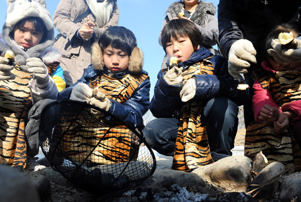 | ▲ 19일 오전 서울 암사동 선사주거지에서 강동구는 겨울방학을 맞아 연 '원시인 겨울나기'에서 초등학생들이 원시복을 입고 신석기인들의 생활을 체험해 보고 있다.(뉴시스) | ||