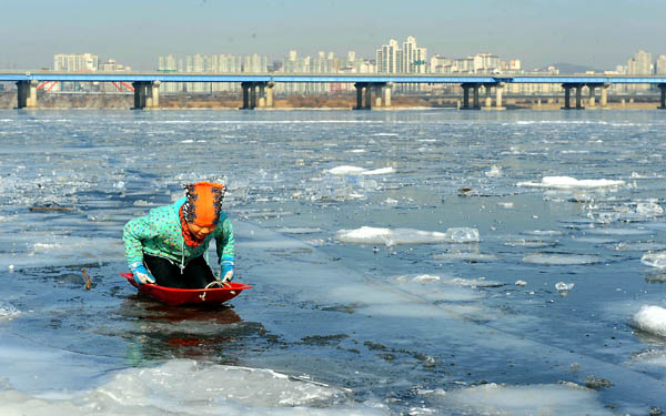 | ▲ 매서운 한파가 기승을 부리는 18일 오후 서울 영등포구 여의도 선창장 한강에서 한 어린이가 썰매를 타고 있다. (뉴시스) | ||