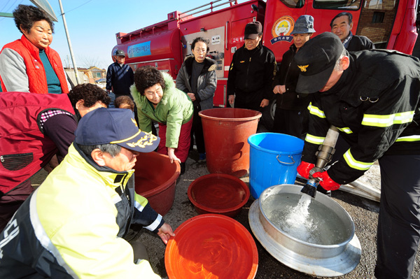 | ▲ 계속되는 한파로 경기지역 곳곳에서 동파, 결빙 등으로 인한 단수지역이 늘고 있는 가운데 17일 경기 평택 송탄소방서 고덕119안전센터 직원과 의용소방대원이 지하수 결빙으로 물공급이 끊긴 고덕면 문곡4리 마을에 식수 및 생활용수를 긴급 지원하고 있다. (뉴시스=경기일보 제공) | ||