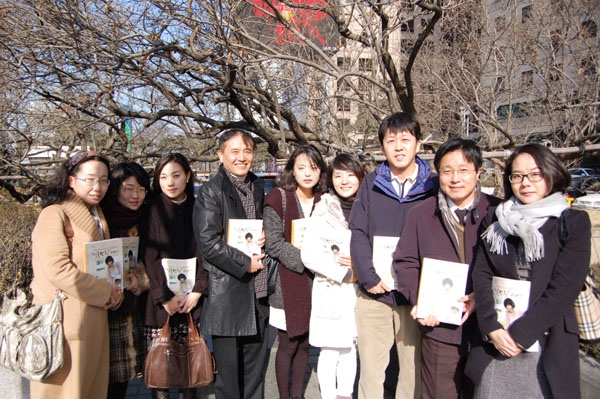 ▲ '식품안전 매뉴얼' 제작에 참여한 기자들이 21일 서울 태평로 한국프레스센터 앞에서 책자를 들어보이며 활짝 웃고 있다. 왼쪽부터 김태경, 곽인숙, 김다슬, 박태균, 최은미, 정명진, 신재원, 이진한 기자, 홍혜현 중앙대 교수. |
