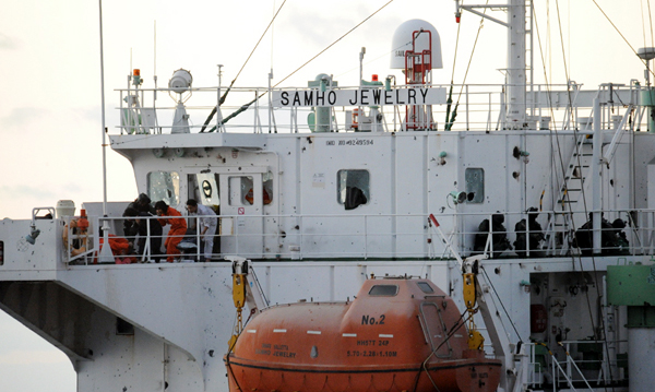▲ 21일 오전 UDT 작전팀이 선교에 해적을 진압하고 안전하고 신속하게 선원들을 대피시키고 있다. (뉴시스=해군 제공) |