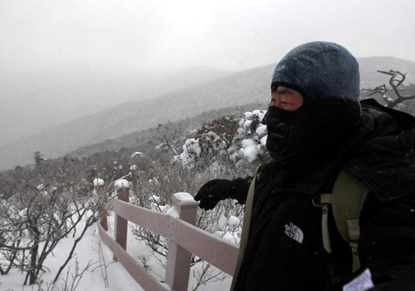 ▲ 사진기자들이 설경을 취재하기 위해선 파카, 입마개, 귀마개, 스키장갑, 내복 등 중무장이 필수적이다. 연일 한파다. 그래도 사진기자들은 맹추위를 무릅쓰고 현장에 간다. 사진은 태백산 정상 취재에 나선 강원일보 권태명 기자. |