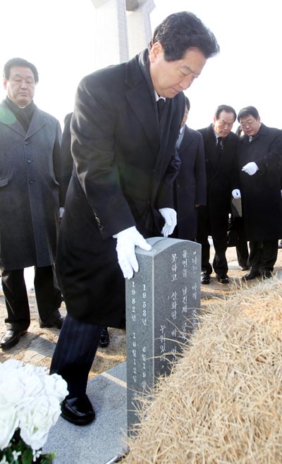 | ▲ 안상수 한나라당 대표가 지도부와 함께 26일 오전 광주 북구 운정동 국립 5·18민주묘지를 찾아 박관현 열사의 묘비를 만지고 있다. 이 과정에서 안 대표가 묘지 상석을 밟아 논란이 일고 있다. (연합뉴스) | ||