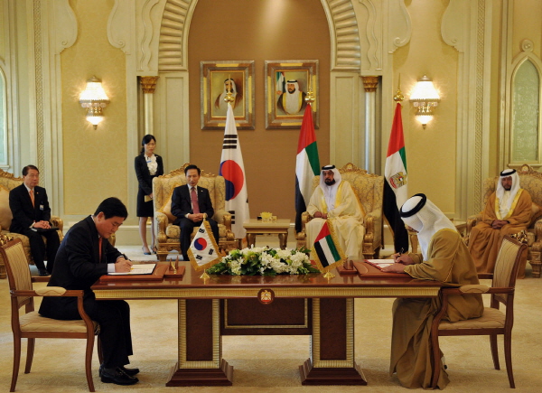 ▲ 2009년 12월 27일 아랍에미리트(UAE)를 방문중이던 이명박 대통령이 아부다비에서 칼리파 빈 자예드 알 나흐얀 UAE대통령과 원전사업 계약 서명식을 하고 있다.(사진=뉴시스.청와대 제공) |