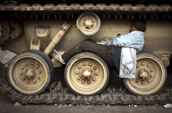 | ▲ 이집트 카이로 타흐리르 광장에서 시위를 벌이던 반 무바라크 시위대원이 탱크바퀴 위에서 쪽잠을 청하고 있다. (카이로(이집트)=AP/뉴시스) | ||