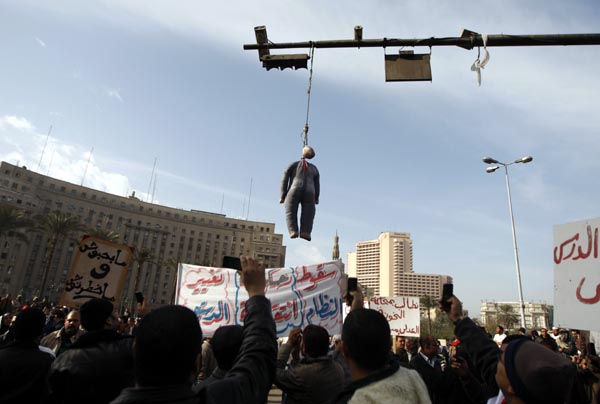 | ▲ 1일(현지시간) 이집트 수도 카이로의 자유의 광장에서 시위대가 호스니 무바라크 대통령 모양의 인형을 목매달고 시위를 벌이고 있다. (카이로(이집트)=AP/뉴시스) | ||