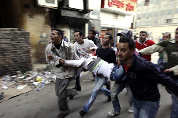| ▲ 지난달 29일(현지시간) 이집트 카이로에서 호스니 무바라크 대통령의 퇴진을 요구하는 대규모 반정부 시위 도중 진압 경찰과의 충돌로 부상을 입은 한 남성을 시위대 대원들이 이송하고 있다. (카이로(이집트)=AP/뉴시스) | ||