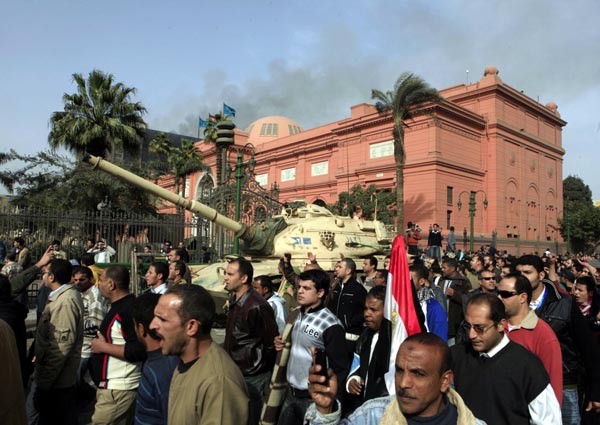 | ▲ 지난달 29일 이집트의 수도 카이로에서 반정부 시위대 수백 명이 이집트박물관을 지키고 있는 탱크 앞을 지나가고 있다. 이날 호스니 무바라크 대통령이 내각 총사퇴와 정치·경제 개혁을 발표했으나 시위대는 타흐리르광장으로 재집결해 호스니 무바라크 대통령의 사퇴를 촉구하는 시위를 이어갔다. (카이로(이집트)=AP/뉴시스) | ||