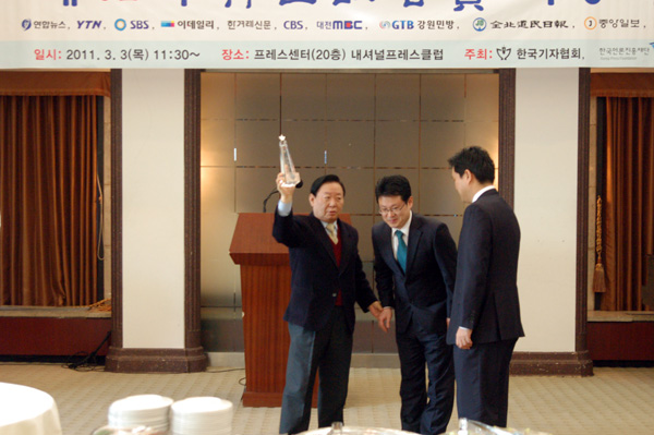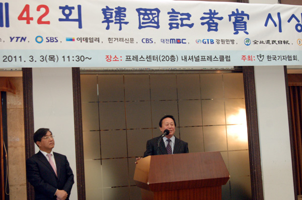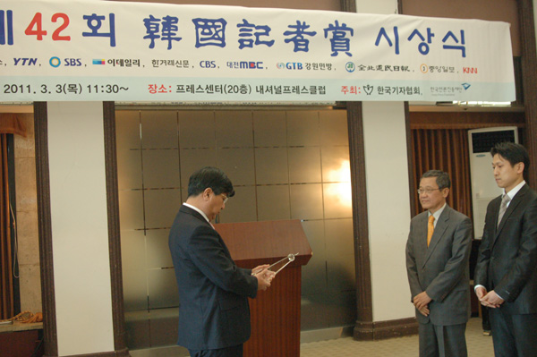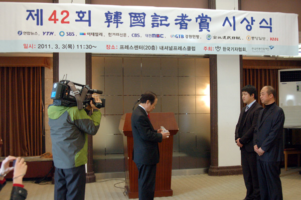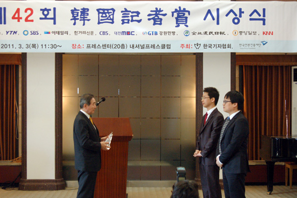 | ▲ 이용균 기자협회 고문이 SBS 김지성, 김범주 기자에 시상하기 앞서 트로피를 높이 들어보이고 있다. | ||