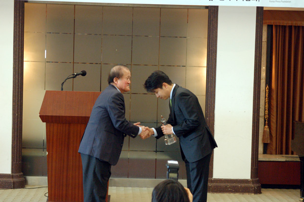 | ▲ 이성춘 기자협회 고문이 이데일리 이진우 기자에 시상하고 있다. | ||
