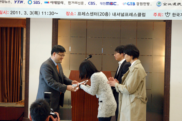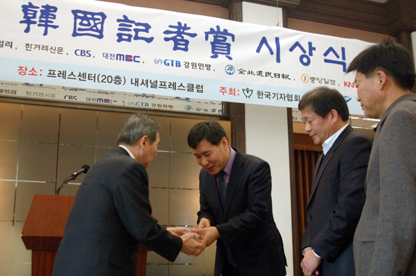 | ▲ 박기병 기자협회 고문이 GTB 조기현, 유세진 기자에 시상하고 있다. | ||