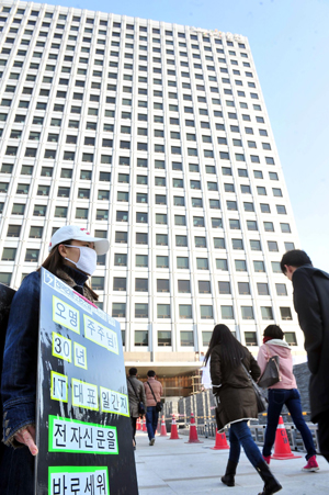 ▲ 전국언론노동조합 전자신문 지부는 회사 정상화를 위한 투쟁을 본격화하며 8일 주요 주주들이 상근하는 회사 앞에서 1인 시위에 돌입했다. 8일 전자신문 주요주주인 오명 웅진에너지·폴리실리콘 회장의 근무처인 충무로 극동빌딩 앞에서 전자신문 조합원이 1인 시위를 하고 있다.(전자신문 노조 제공) |