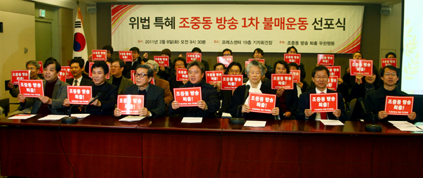 이들은 “조중동 방송은 반칙과 특권”이라며 “지난 2008년 한나라당이 내놓은 새로운 미디어법안은 오직 조중동 방송을 만들기 위한 ‘맞춤형 법안’”이라고 비판했다.