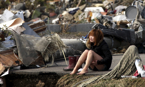 | ▲ 일본 동북부에 강진 발생 사흘째인 13일 미야기현 나토리의 폐허 속에서 한 주민이 흐느끼고 있다. 일본 현지 언론은 사망자 수가 1만 명을 넘어섰다고 보도했으며 간 나오토 일본 총리는 이번 대지진이 "2차 세계대전 이후 가장 어려운 위기"라며 전국민의 단결을 호소했다. (나토리(일본)=AP/뉴시스) | ||
